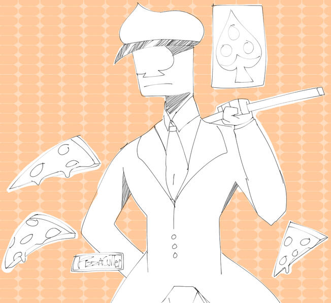 I am an anxious person when it comes to sharing things I make. But I do like making things.My character that I use to represent me is a png of a full cheese pizza on a suited body. But mushrooms can be added as a topping. This is how I use to represent me as a person.The roller part of my username is referring to pizza cutters. I do not like pizza rolls.Pizza spade is a character I use as a mascot.The way I draw is inspired by Mortis Ghost's art. His art is what inspired me to draw.